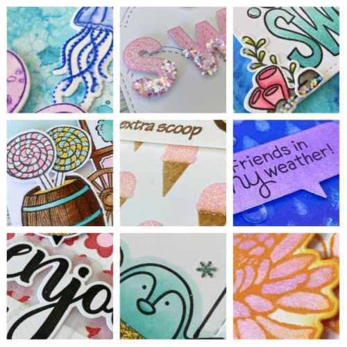- 12 handmade cards were created. The cards include some of the newest products from many companies including Lawn Fawn, Newton’s Nook, Hero Arts, Honey Bee Stamps, Tim Holtz/Stampers Anonymous, and Purple Onion Designs, Colorado Craft Company, Trinity Stamps, The Rabbit Hole Designs, Simon Says Stamps and more.