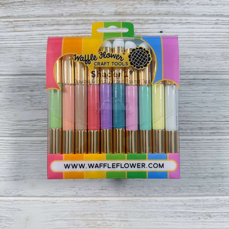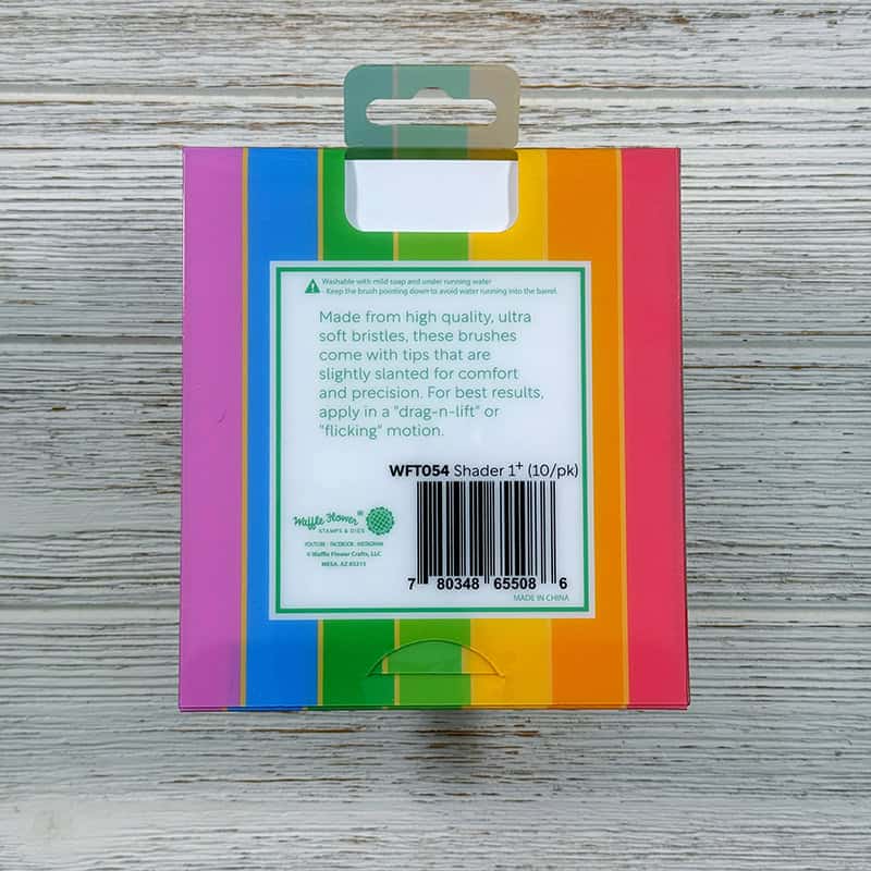 The Waffle Flower Shader Brush 1+ Rainbow Pack features a set of 10 brushes with pastel rainbow handles. Crafted with ultra-soft, vegan synthetic bristles, these brushes have a slanted round tip designed for comfort and precision.